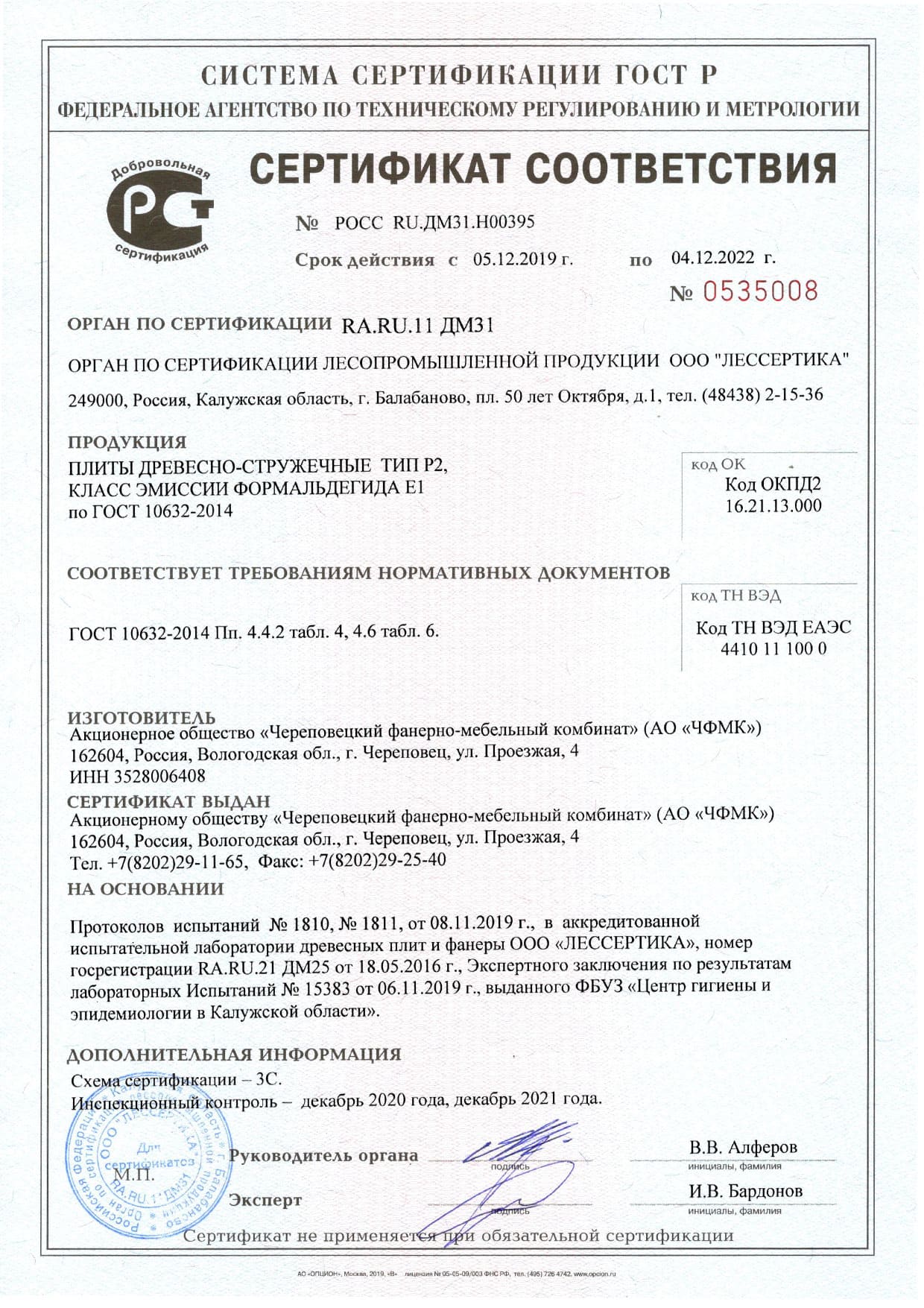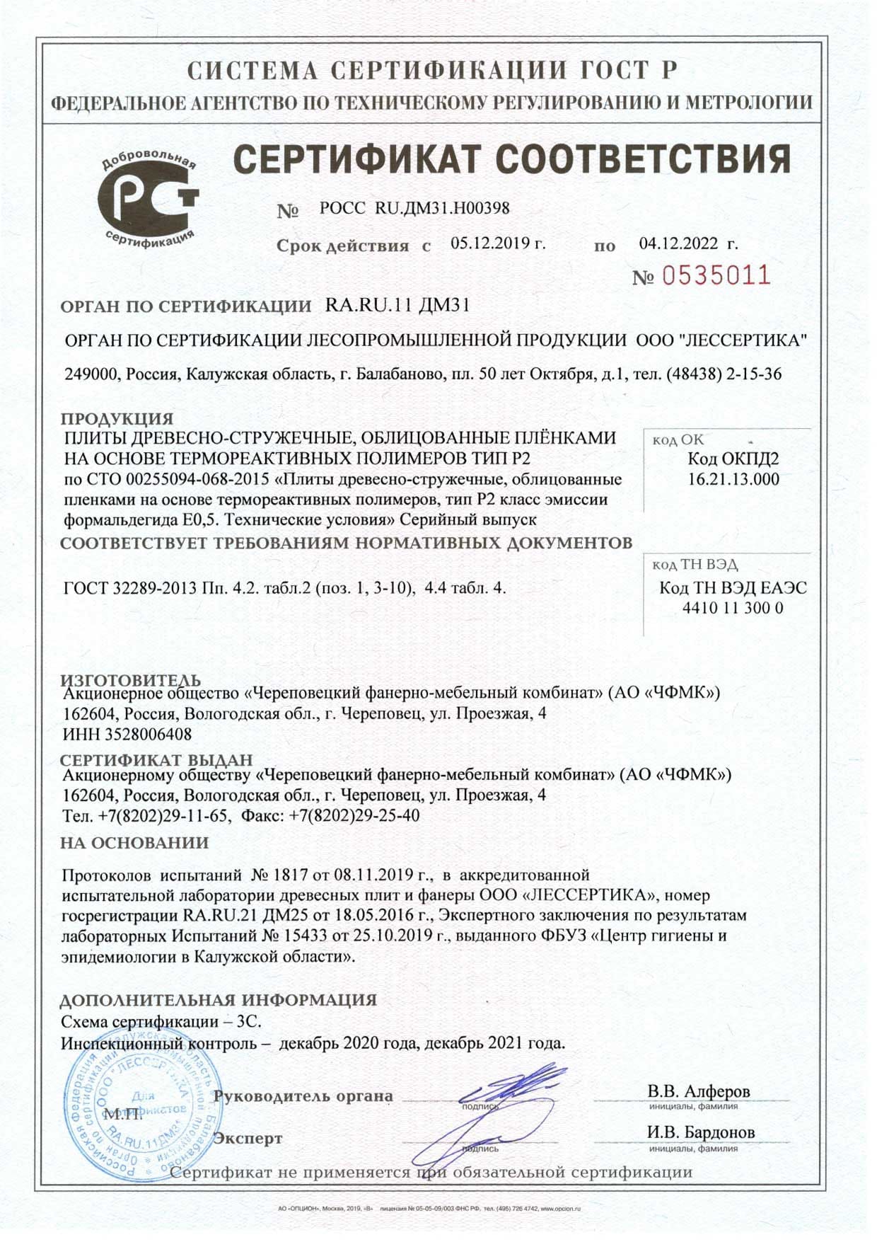 Сертификат соответствия ЛДСП. Класс эмиссии Е0.5